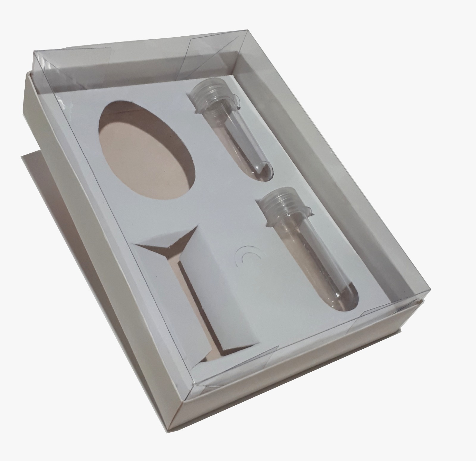 Tampa de acetato transparente, destacando a beleza do seu produto.